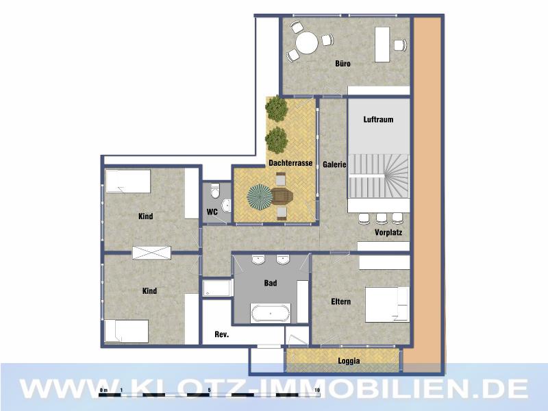 Vier großzügig geschnittene Räume im Obergeschoss bieten selbst einer großen Familie Platz. Das Elternschlafzimmer verfügt über einen eigenen Zugang zum geräumigen Bad, außerdem führt vom Schlafzimmer ein Ausgang zu einer Loggia mit Ostausrichtung.