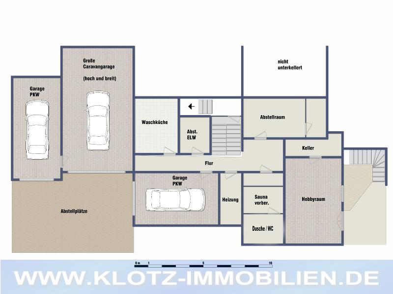 Vom Untergeschoss aus gelangt man in die Garagen. Besonderheit hierbei ist eine sehr hohe, breite und lange Caravan-Garage. Dazu gibt noch zwei weitere Einzelgaragen. Und wenn das noch nicht reicht, haben Sie natürlich auch Stellplätze vor den Garagen.
