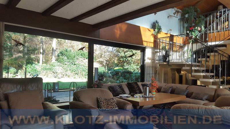 Im gemütlichen Wohn- und Essbereich genießt man rundum den herrlichen Blick in die Natur. Durch die offene Raumgestaltung und die beiden großen Fensterfronten kommt sehr viel Helligkeit ins Haus. Die großen Schiebetürenfenster zu den Terrassen ermöglichen einen direkten Zugang in den Außenbereich. Der traumhafte parkähnliche Garten ist überaus großzügig und lädt auf verschiedenen Terrassen und Plätzen zum Entspannen ein.
